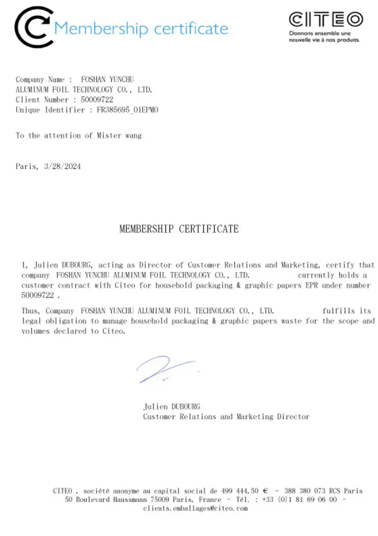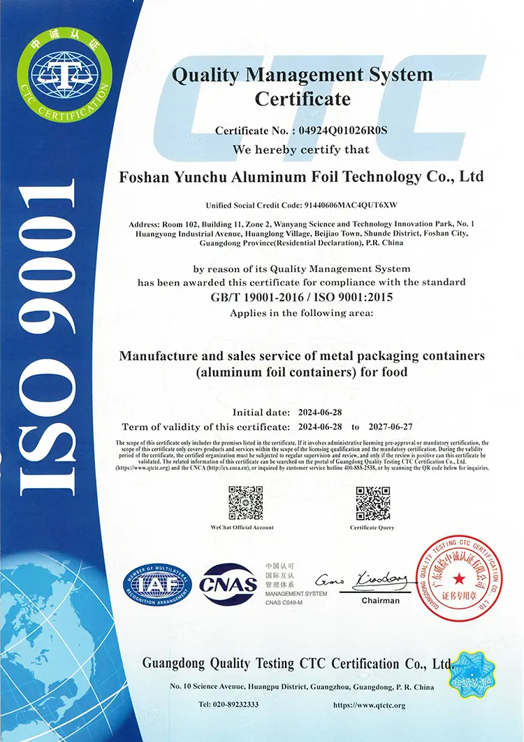 Foshan Yunchu Aluminium Foil Technology Co., Ltd. Atende estritamente aos padrões internacionais de qualidade. Nossos produtos obtiveram: