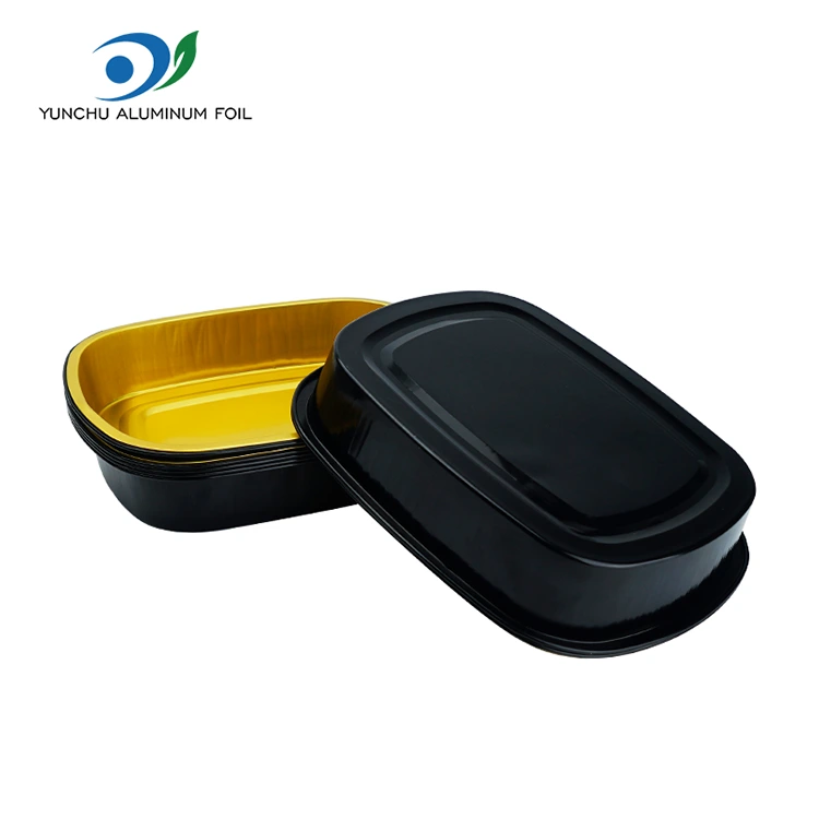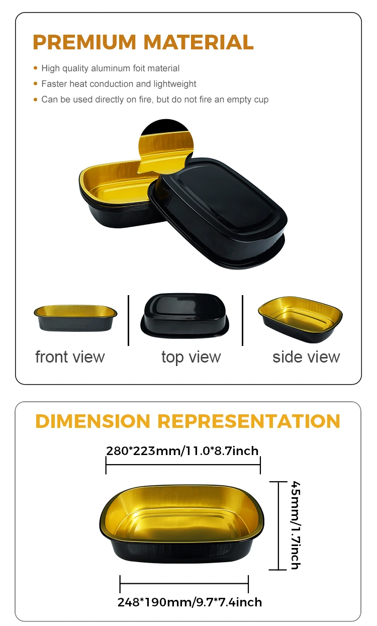 Yunchu Aluminum Foil Supplier Disposable black gold catering Rectangular Aluminum Foil Containers is suitable for large-volume catering and takeaway industries, especially suitable for baking, catering chains and self-service chains and other scenarios, the product is made of 8011 food-grade aluminum foil material, the height is low and suitable for some turkey, grilled fish, stew and other foods with many ingredients to place, Pode ser usado com tampa de vedação em papel alumínio e tampa totalmente transparente, com excelente desempenho de vedação, resistência à alta temperatura e função de prevenção de óleo e vazamento. É amplamente utilizado em vários cenários, como embalagem de alimentos, aquecimento, refrigeração e entrega de viagem. A superfície adota um design de parede leve, com uma aparência plana e suave, que é conveniente para a vedação automática de filme selado, melhorando assim a eficiência da embalagem.