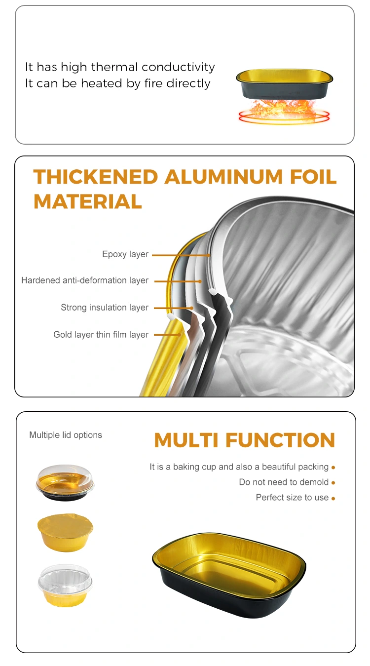 ​Yunchu Aluminum Foil Supplier Disposable black gold catering Rectangular Aluminum Foil Containers is suitable for large-volume catering and takeaway industries, especially suitable for baking, catering chains and self-service chains and other scenarios, the product is made of 8011 food-grade aluminum foil material, the height is low and suitable for some turkey, grilled fish, stew and other foods with many ingredients to place, Pode ser usado com tampa de vedação em papel alumínio e tampa totalmente transparente, com excelente desempenho de vedação, resistência à alta temperatura e função de prevenção de óleo e vazamento. É amplamente utilizado em vários cenários, como embalagem de alimentos, aquecimento, refrigeração e entrega de viagem. A superfície adota um design de parede leve, com uma aparência plana e suave, que é conveniente para a vedação automática de filme selado, melhorando assim a eficiência da embalagem.