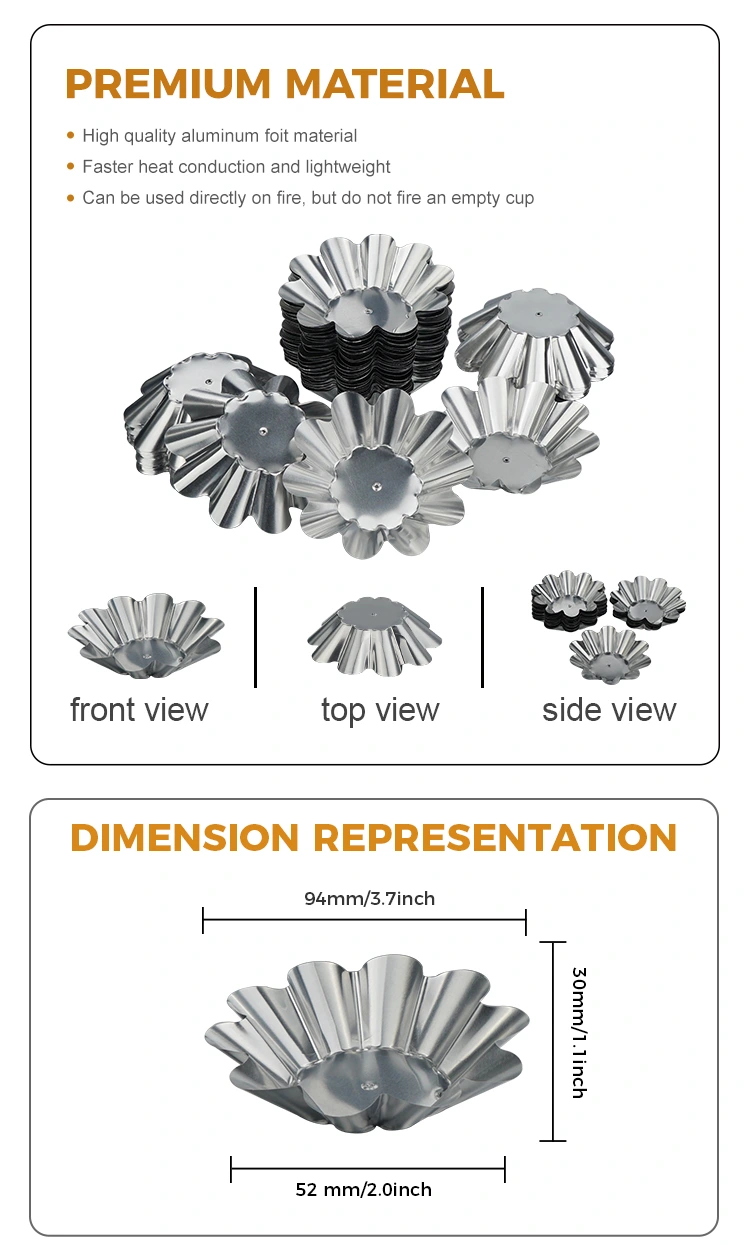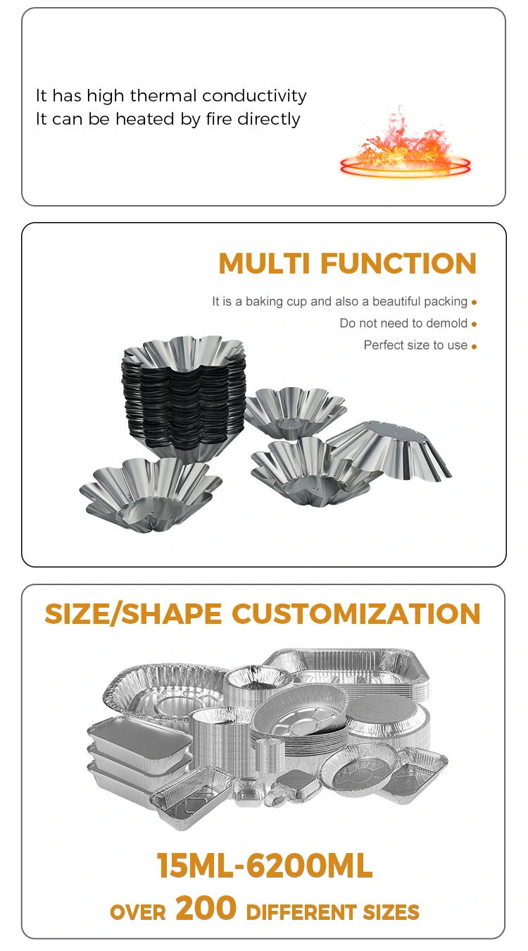 Cenas externas e convenientes: leves e portáteis, adequadas para camping ao ar livre, piqueniques, festas e outras cenas. Tortas de ovo e salgadinhos podem ser preparados com antecedência e colocados em recipientes sem carregar assadeiras pesadas. Eles podem ser descartados logo após comer. É fácil de limpar e não ocupa espaço. Também pode ser usado para embalagens para viagem. As propriedades de vedação e preservação do calor do material de folha de alumínio podem efetivamente manter a temperatura e o sabor das sobremesas e evitar vazamentos e deformações durante o transporte.