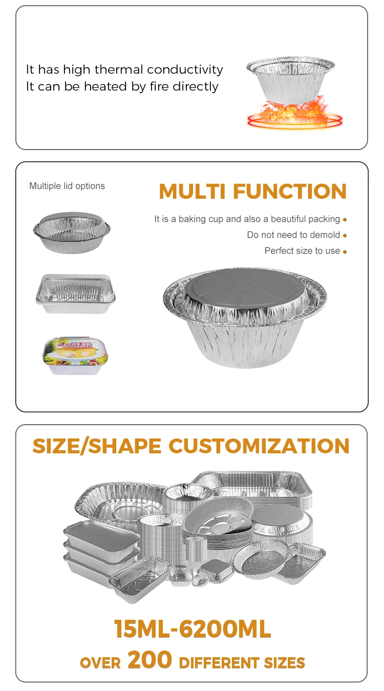 Fornecedor de alumínio de alumínio do yunchu redonda de alimentos de alumínio prata de pacote pequeno O forno de microondas, caixa inteira, pode ser usado em chamas abertas, o material espessado da caixa de alumínio não é fácil de se deformar, os produtos de caixa de papel alumínio usados ​​são de plástico e será mais conveniente de usar ao usar. Os alimentos podem ser feitos de várias maneiras para atender às suas condições de produção. There are a variety of styles to choose from, to meet the needs of various uses, two types of lids to choose from, transparent aluminum foil lid, plastic material, transparent lid is not easy to fog up 1-2 cm higher than the lunch box (cannot be used at high temperature), aluminum foil cover, silver aluminum film cover, tin foil surface can block oil stains, more convenient to pack and use (can withstand high temperature).