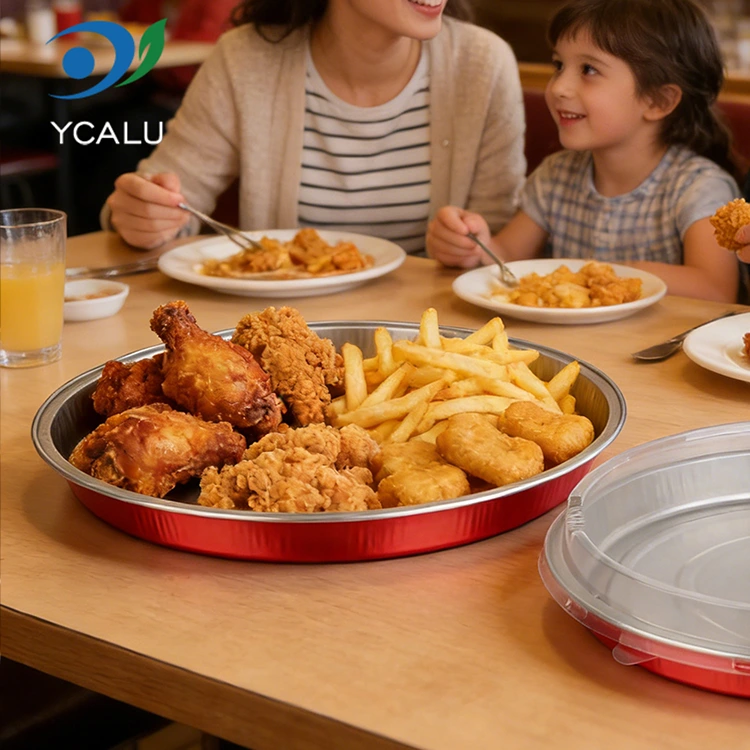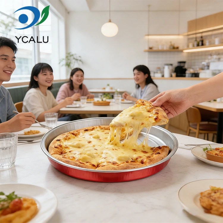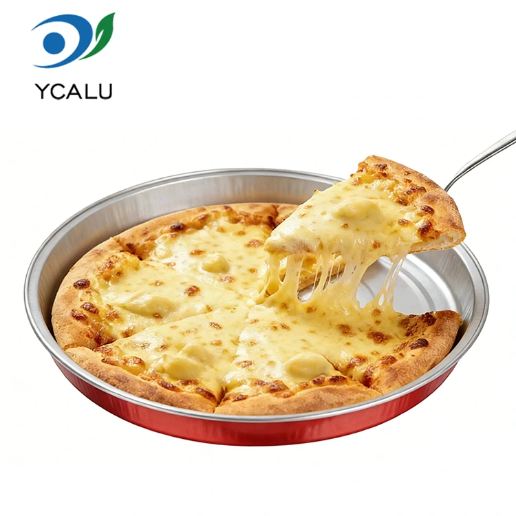 Fornecedor de folha de alumínio Yunchu C900 Panela de pizza descartável para embalagem Recipiente redondo de folha de alumínio é feito de folha de alumínio cru de qualidade alimentar, sem odor e impurezas, tornando seguro tocar nos alimentos com confiança. A espessura é uniforme e sólida e pode suportar altas temperaturas de até 250°C e baixas temperaturas de até -20°C. Pizza recém-quente pode ser servida diretamente. Pode ser refrigerado e mantido fresco sem troca de recipiente. Pode ser consumido diretamente por aquecimento, o que melhora muito a eficiência da entrega dos alimentos e evita o trabalho de limpeza. A cobertura PET de folha de alumínio bloqueia eficazmente a intrusão de vapor de água e ar e evita fugas de gordura. O arco redondo clássico se adapta com precisão a todos os tipos de formatos de pizza, com vários tamanhos disponíveis de 7 a 9 polegadas. É perfeitamente adequado para diferentes especificações, como pizza artesanal, pizza italiana e massa grossa americana. Não há espaço extra para evitar que a pizza deslize e a cobertura caia. O processo de moldagem de peça única cria uma forma estável, é resistente à pressão e colisão e não é facilmente deformado ou danificado durante o transporte. Ele também pode manter sua forma quando empilhado e armazenado, resolvendo completamente o problema de embalagens de comida facilmente danificadas e garantindo que cada pizza seja entregue em boas condições.