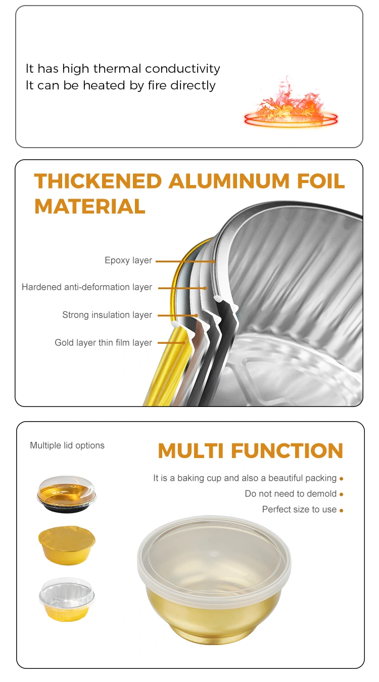 Fornecedor de folha de alumínio Yunchu, recipientes redondos descartáveis ​​​​de folha de alumínio para tigela de ouro, folha de alumínio espessada, alta dureza, não é facilmente deformado, pode ser selado sem vazamento, forte resistência ao calor, reutilizável, servindo como molde e embalagem, embalagem de folha de alumínio para esterilização em alta temperatura é segura, higiênica e tem boas propriedades de isolamento térmico - forte resistência ao calor - pode ser cozida no vapor, refrigerado, congelado e reciclável. Membrana interna de PE de qualidade alimentar, material metálico emparelhado com membrana interna de PE de qualidade alimentar, corpo do frasco grosso incolor e inodoro faz com que o frasco pequeno não seja facilmente deformado, fornecendo boa proteção, forte segurança de vedação e confiabilidade, a tampa da garrafa combina firmemente com o corpo da garrafa, a vedação forte mantém o frescor do produto por mais tempo, materiais completamente novos que são seguros, ecologicamente corretos e inodoros. Os recipientes redondos descartáveis ​​​​de folha de alumínio com tigela pequena de ouro são amplamente utilizados em várias indústrias de alimentos, como fábricas de alimentos, fábricas de doces, fábricas de frutas secas, padarias, lojas de alimentos especializados e lojas de classificação de frutas secas, etc.