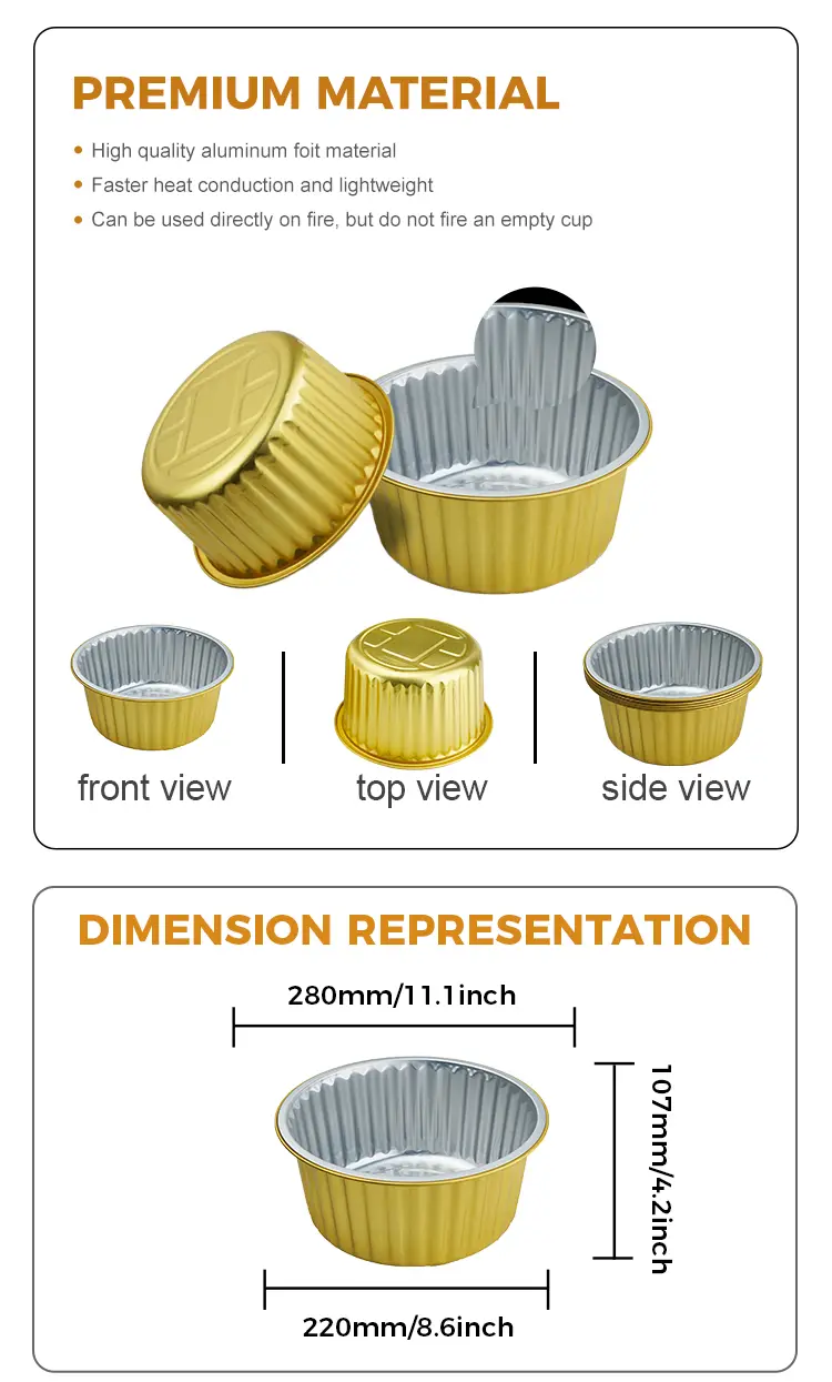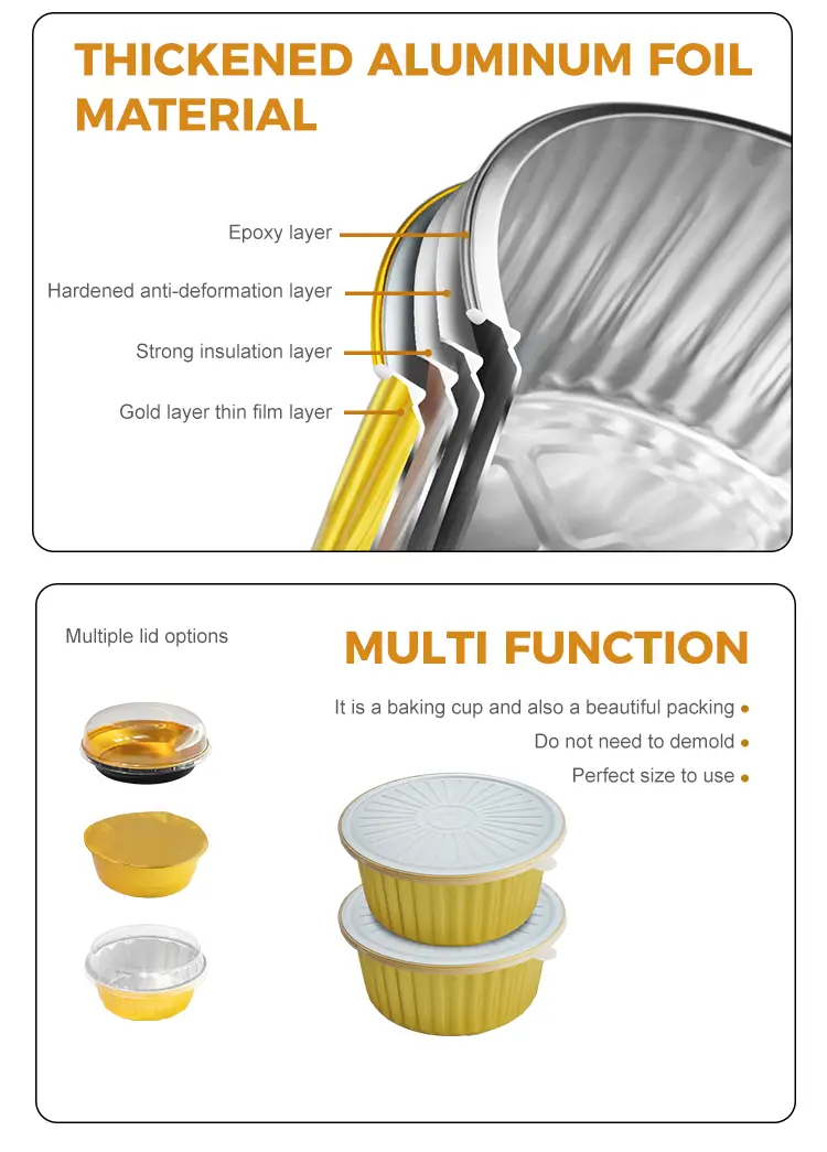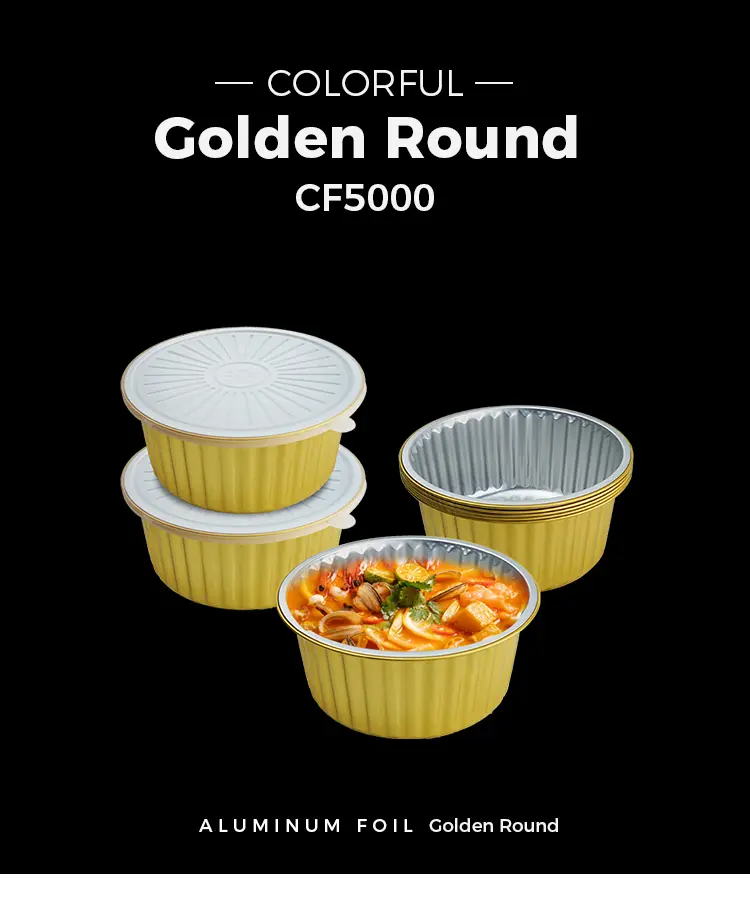 A alumínio de alumínio Yunchu descartável com alumínio redondo selações de alumínio redondo selações de alumínio Modelo CF5000 O atacado de suprimentos tem uma ampla gama de usos, pode usar a tampa de vedação de calor de alumínio coberta para assar, armazenamento, transporte e suprimento de todos os tipos de alimentos para alimentos, etc. Festas de férias, atividades de catering, lojas de catering de autoatendimento, etc., recipiente descartável de alumínio redondo de alumínio redondo selações feitas de papel alumínio 8011-0 de alta qualidade, a assadeira descartável com tampa é durável, não facilmente perfurada ou danificada; O material permite uma distribuição uniforme de calor, boa retenção de calor, sem graça, sem queima, impermeável e à prova de óleo, sem necessidade de limpar, sem carga sobre manchas de óleo. As bordas suaves não machucam as mãos, garantindo que os pratos pré-preparados estejam totalmente cozidos; A panela de papel alumínio é finalizada em uma cor de ouro elegante que aprimora a apresentação e complementa sua decoração de cozinha ou evento.