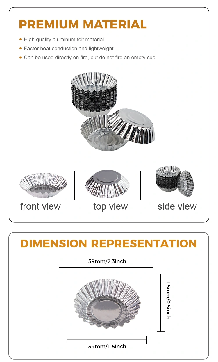 Non-slip Aluminum Foil Container Cup Body Cup body is designed with anti-slip texture, increase friction, prevent slipping, curled cup mouth design, easy to take, will not hurt hands, multiple large capacity design at one time forming, no need to clean, save time and energy, widely used for baked egg tarts, cakes, egg yolk crisps, bowl cakes and other delicacies, environmentally friendly materials have passed German ERP certification, EU SGS Certificação e certificação do sistema de gerenciamento da qualidade ISO9001, garantam a segurança e a simpatia ambiental do produto.