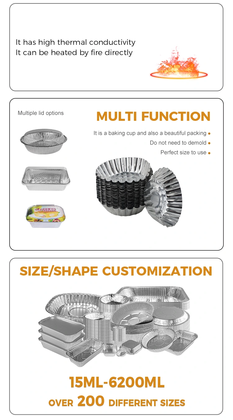 Torda de alumínio de alumínio Yunchu Borda de torrada de alumínio prata alumínio Recipiente de alimentos Recipiente por atacado projetado para tortas de ovos e outras sobremesas. É feito de folha de alumínio com qualidade de alimento, que é segura e não tóxica, e possui boa condutividade térmica, garantindo que o alimento seja aquecido uniformemente e tenha um sabor melhor durante o processo de cozimento. This egg tart tray is versatile and suitable for various occasions such as family gatherings, business events, etc. Easy to remove the mold at high temperature when using, after the finished product is completed, easy to remove the film, non-stick bottom, do not damage the shape, thicken and harden the material that is not easy to deform, good pressure resistance, say goodbye to the trouble of washing the pot and easily protect the pot, isolate oil stains without cleaning after use, smooth bottom is not easy Para queimam e grudam no fundo, é fácil cozinhar alimentos antiaderentes, o fundo é liso, pode suportar -20 ° C ~ 300 ° C, pode ser aquecido sobre uma chama aberta e o molde é aquecido uniformemente.