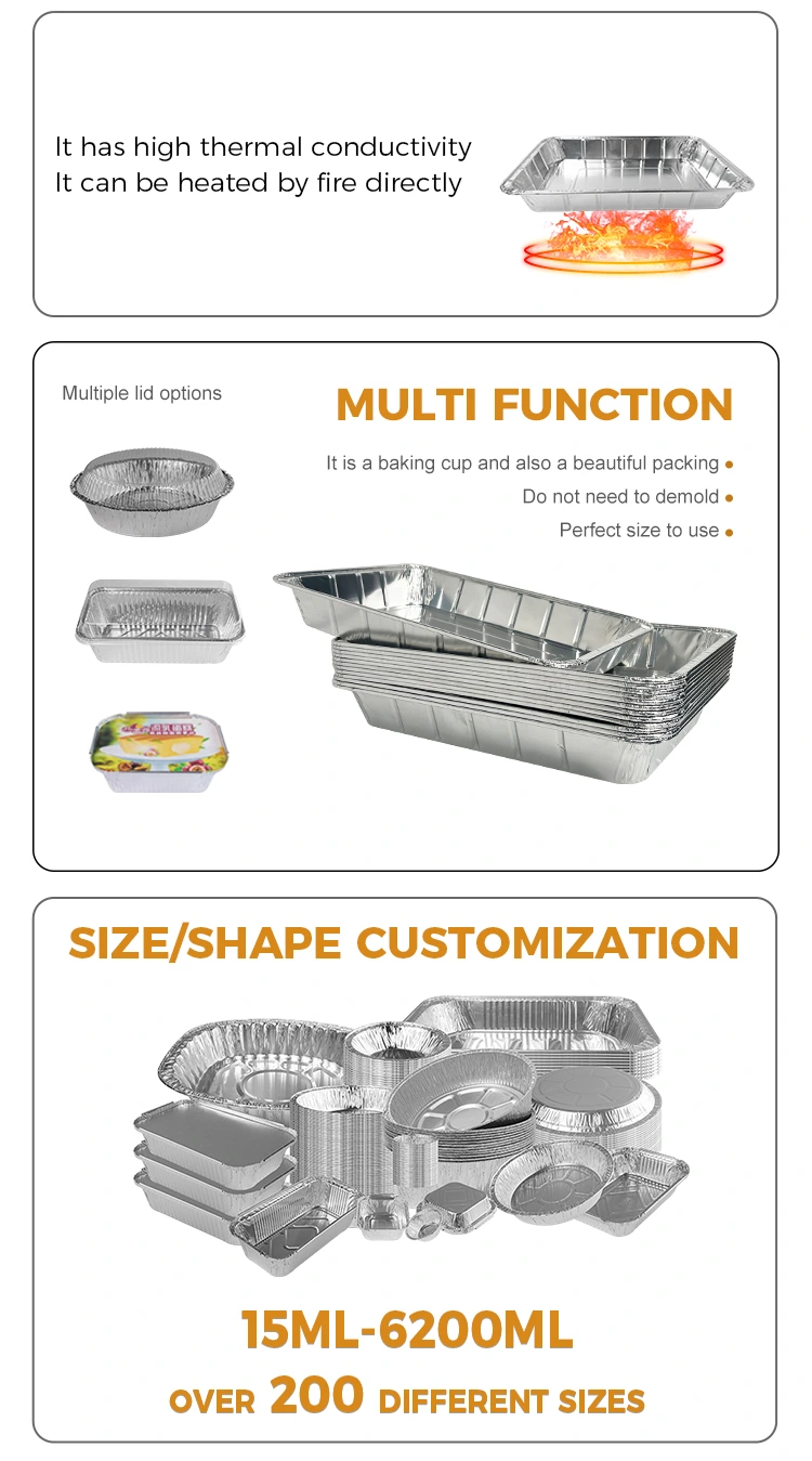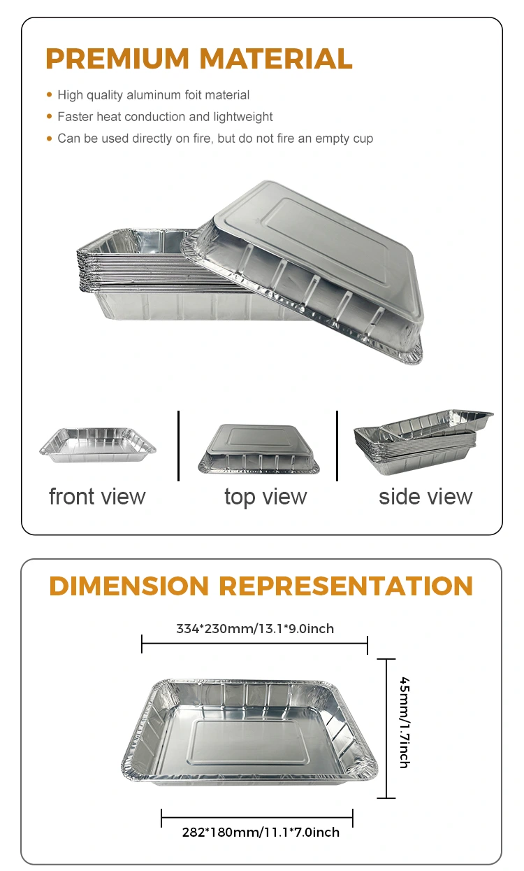 Fornecedor de folha de alumínio Yunchu Grande peixe grelhado para que os recipientes de alumínio de alumínio prateado atenda a uma variedade de necessidades de culinária, adequadas para várias ocasiões, como fritadeiras de ar, churrasqueiras, fornos de churrasqueira e fabricação de frutos do mar. Este recipiente de papel alumínio é projetado especialmente com uma borda elevada para impedir efetivamente os alimentos de derramar e grudar na parede da panela, e protege o revestimento da panela com várias camadas, o que é prático e sem preocupações. É feito de material 8011-0 de grau de alimento, com uma temperatura resistente ao calor de até 520 ° C, não queimada ou quebrada, e o material espessado facilita a deformação. A caixa de papel alumínio é espessada como um todo, para que você possa pegá -la facilmente depois de cozinhar sem se preocupar com a deformação durante o uso. O design da bainha torna confortável de segurar e as bordas são arredondadas, para que você não precise se preocupar em arranhar os dedos. As bordas lisas são complementadas por pálpebras totalmente transparentes e tampas de papel alumínio, tornando -as mais adequadas para uma variedade de métodos de cozinha.