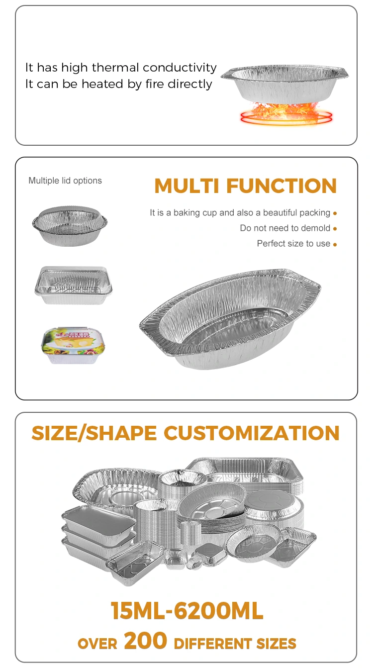 O fornecedor da folha de alumínio Yunchu oferece recipientes oval de alumínio de alumínio prateado para cozinhar casos, padarias, cadeias de lojas e entrega de alimentos refrigerados. Criado a partir de material de papel alumínio de grau de alimento, este recipiente possui uma forma oval única que o destaca entre as muitas caixas de assadeira de prata. Este contêiner é especialmente adequado para reter lenços quentes, frutas, pão e todos os tipos de alimentos de resposta, e pode atender às necessidades de uma ampla gama de louças. Devido à sua boa condutividade térmica, ela pode dissipar uniformemente temperaturas altas, garantindo que os alimentos sejam aquecidos uniformemente. Além disso, possui uma certa capacidade de carga e resistência à pressão, mantendo a estabilidade, mesmo no caso de várias pilhas, impedindo a deformação e é ideal para uso durante o transporte. Para se adaptar melhor a diferentes cenários e necessidades, esse contêiner também pode ser personalizado de acordo com os requisitos do cliente e fornecer tampas correspondentes para maior praticidade.