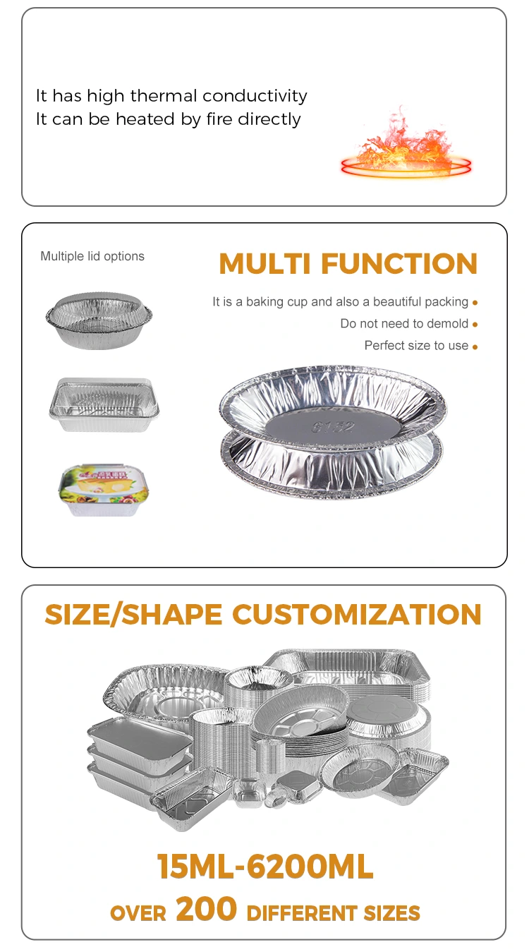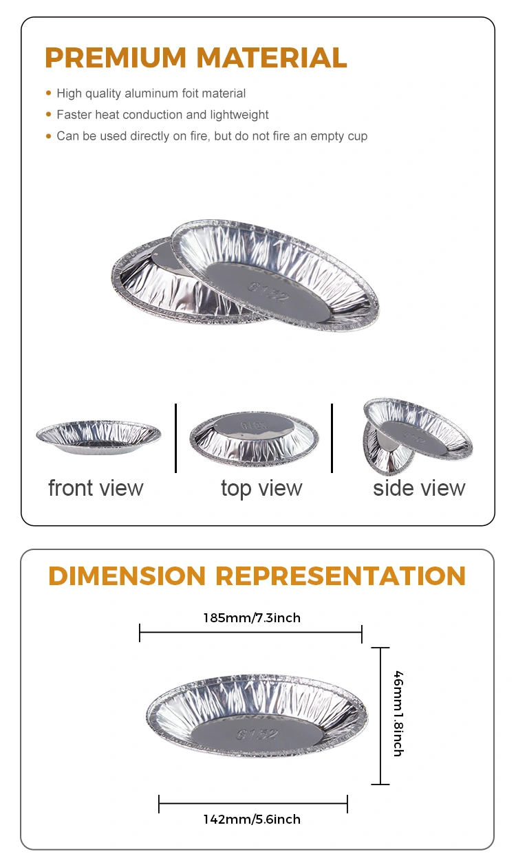 Os recipientes de alumínio prateado de alumínio prateado de ovais de alumínio de alumínio Yunchu são únicos no mercado com suas excelentes características do produto. Este recipiente conduz calor uniformemente e não queima facilmente, garantindo que a comida seja aquecida uniformemente e cozinhe comida deliciosa e segura. Suas propriedades resistentes a óleo e resistentes a manchas facilitam a demolição, com uma forma plissada ao redor para facilitar o acesso e um fundo arredondado e liso que pode ser rapidamente desmolado com apenas um botão de luz. Jogue fora após o uso, sem necessidade de limpar, que é sem preocupações e higiênico. Este contêiner tem uma grande capacidade e pode manter vários ingredientes de uma só vez, tornando -o adequado para várias necessidades de cozimento. Seja tortas, bolos ou batatas fritas de gema de ovo, bolos de tigela, churrascos e outras iguarias, é uma escolha versátil.