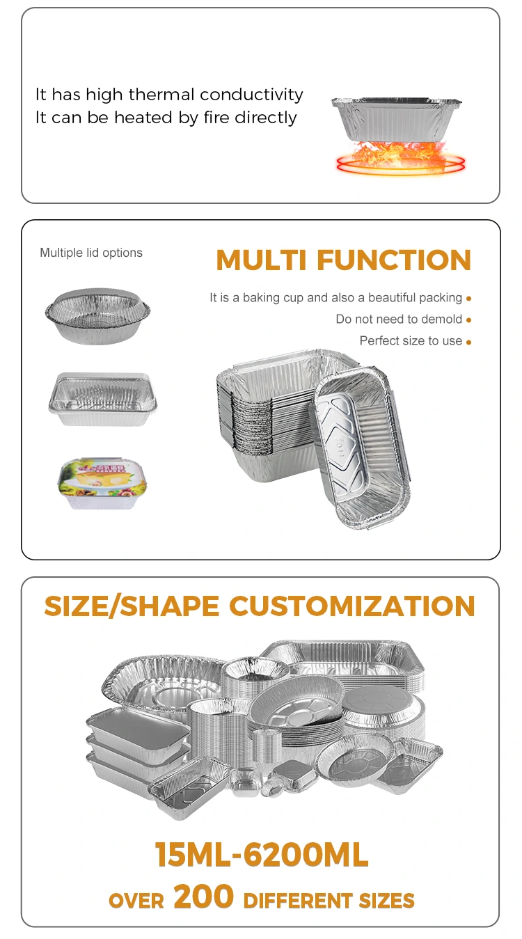 Recursos: A lancheira de alumínio que fornecemos é feita de material de papel alumínio 8011, que possui excelente desempenho de preservação de calor e pode efetivamente manter a temperatura dos alimentos, tornando sua comida mais atraente. Em particular, nossos recipientes retangulares de alumínio prateado de arroz assado não apenas possuem propriedades de isolamento térmico, mas também podem ser combinadas com tampas de alumínio ou tampas de plástico para animais de estimação para facilitar a personalização personalizada de logotipos, aprimorando assim os pontos de memória do cliente e aumentando a conscientização da marca.