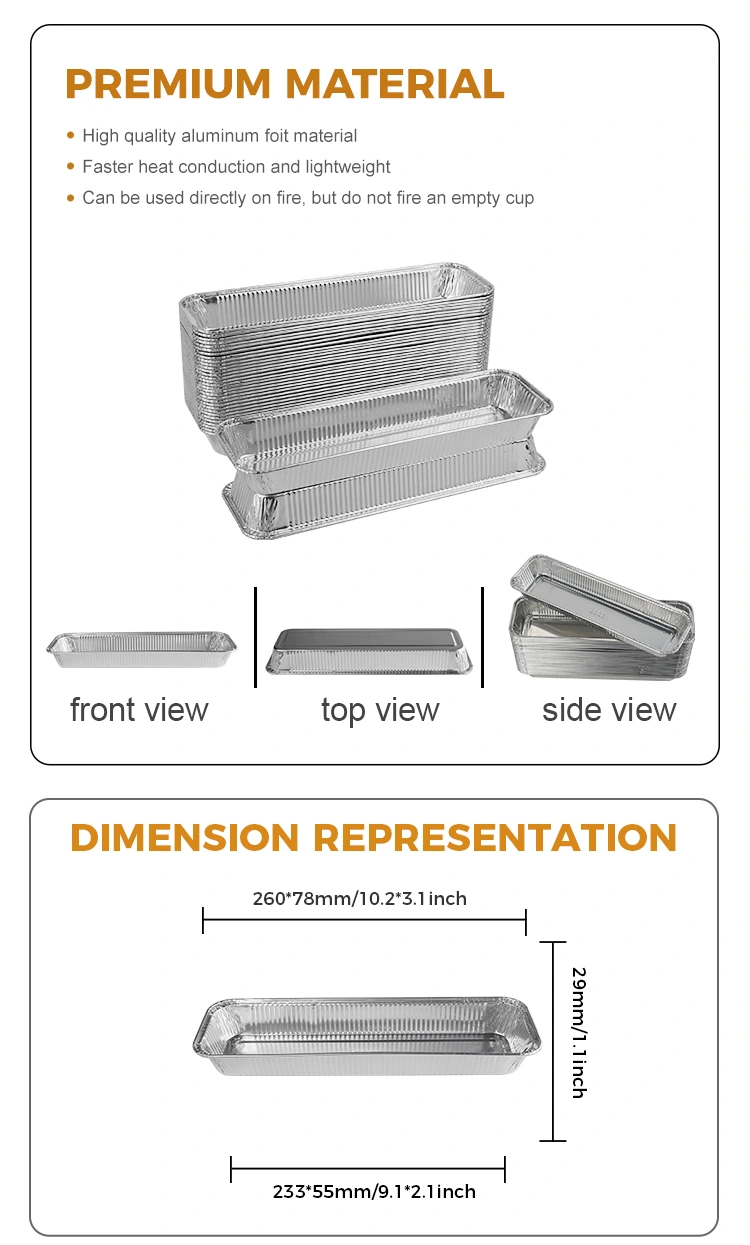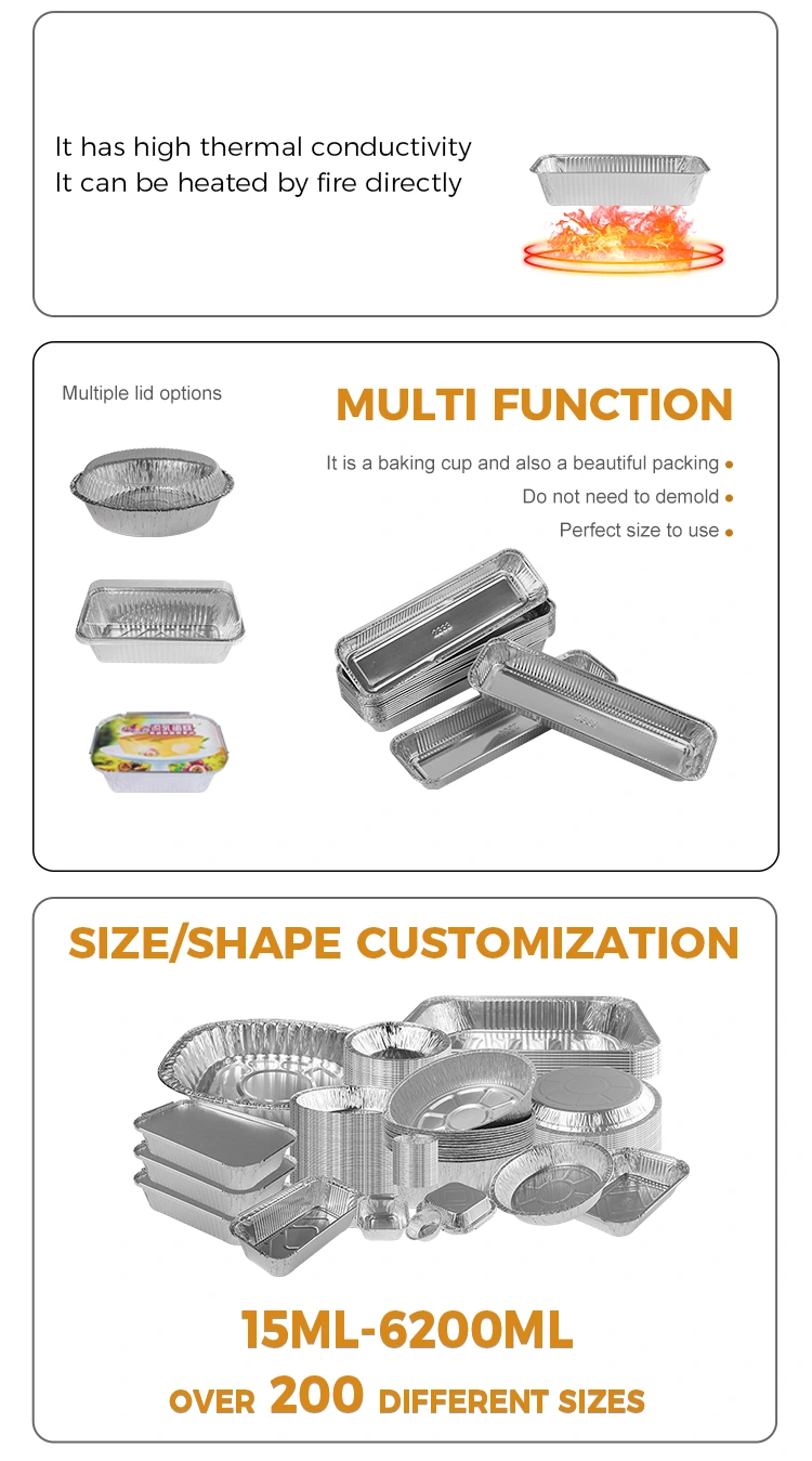 Recursos: O atacado de lancheira é feito de material de papel alumínio 8011, que tem um bom efeito de preservação de calor e pode manter a temperatura dos alimentos, tornando os alimentos mais deliciosos e deliciosos. Além disso, nosso recipiente retangular de alumínio prateado para churrasco também possui uma função de isolamento térmico e pode ser comparado com tampa da folha de alumínio e tampa de plástico para animais de estimação.