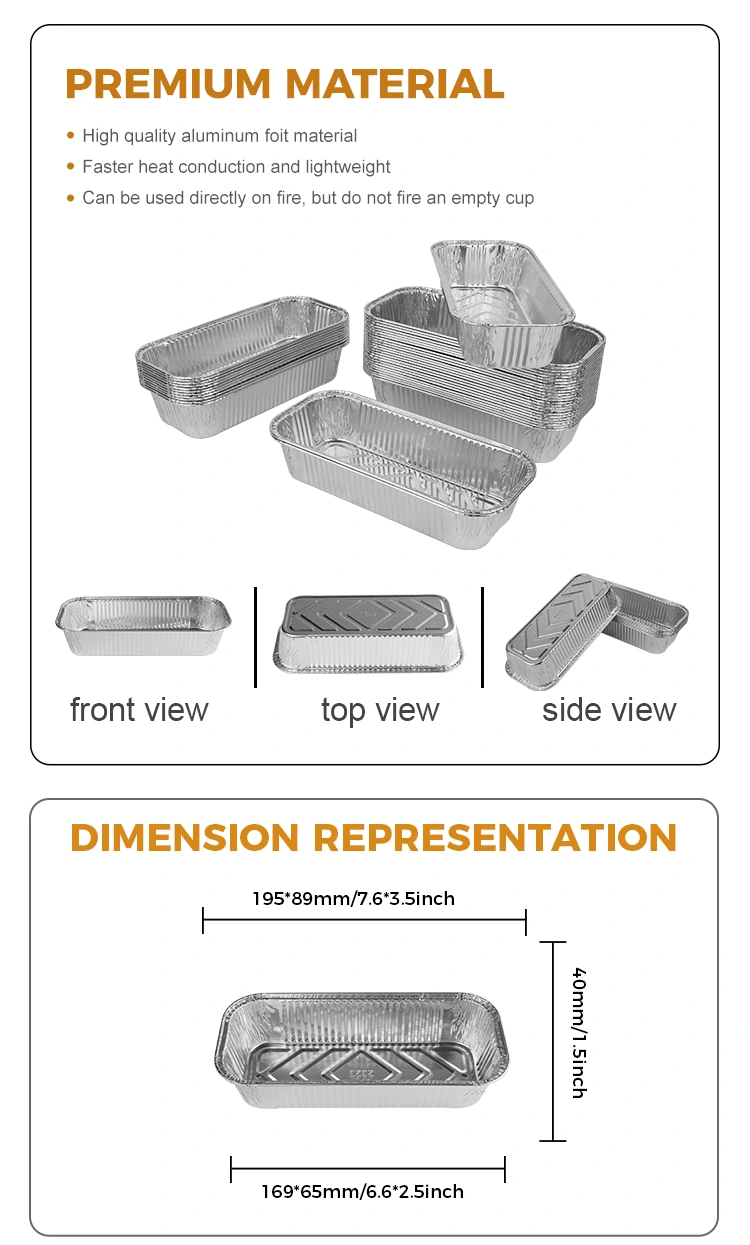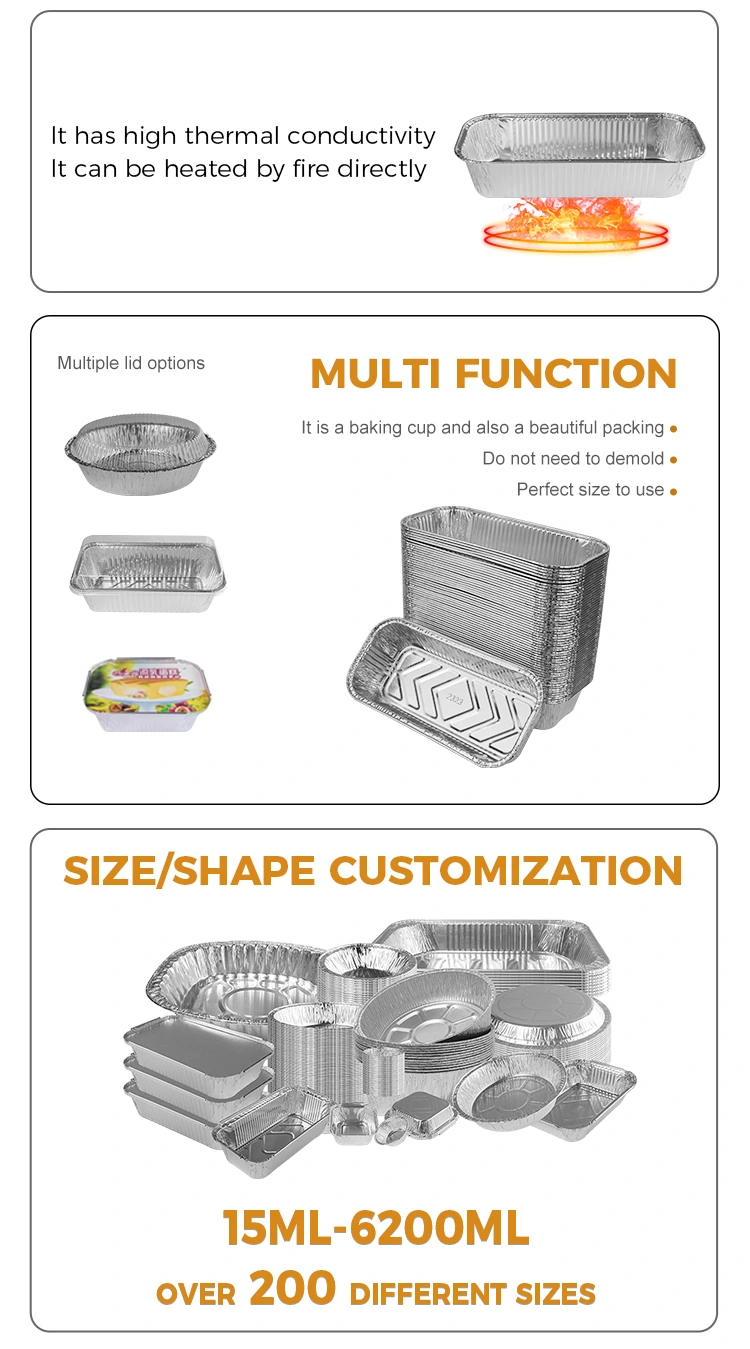 Características: Lunhana de que o material de alumínio 8011 de alumínio é feito de boa preservação de calor, que pode manter a temperatura dos alimentos e tornar os alimentos mais deliciosos. Além disso, nosso recipiente retangular de churrasco de alumínio prateado também possui uma função de preservação de calor, que pode ser combinada com tampa de papel alumínio e tampa de plástico de animais de estimação, o que é conveniente para você personalizar seu logotipo, aprofundar ainda mais a impressão do cliente e aprimorar a imagem da sua marca.