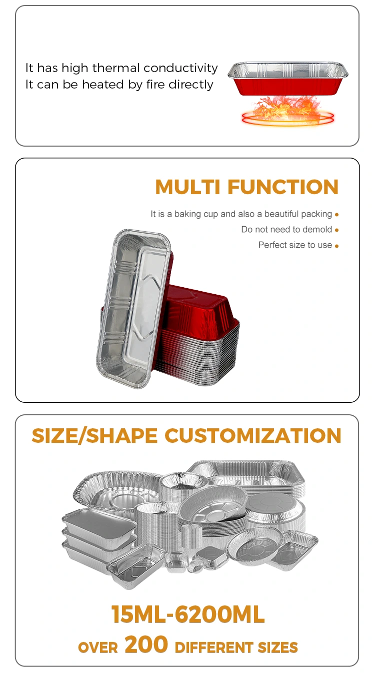 A folha de alumínio Yunchu fornece recipientes retangulares de folha de alumínio prateado para padaria vermelha de alta qualidade, que são projetados para serem duráveis ​​e resistentes ao calor, podem conduzir o calor uniformemente para evitar carbonização e têm vedação forte para mantê-los frescos.
